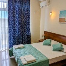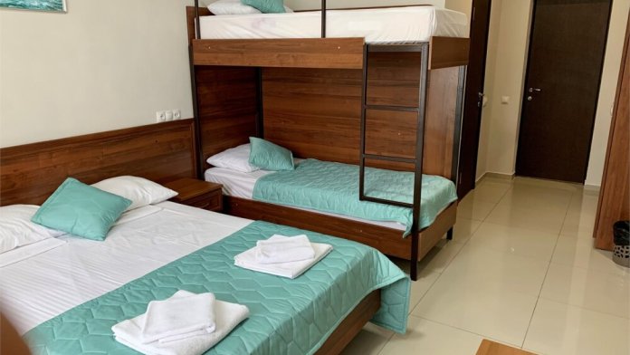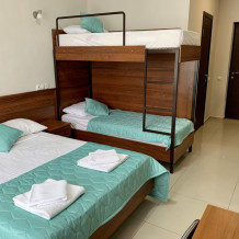 Номере категории «Четырехместный стандарт с балконом» гостям предлагается размещение с двуспальной кроватью и одной двухъярусной кроватью.