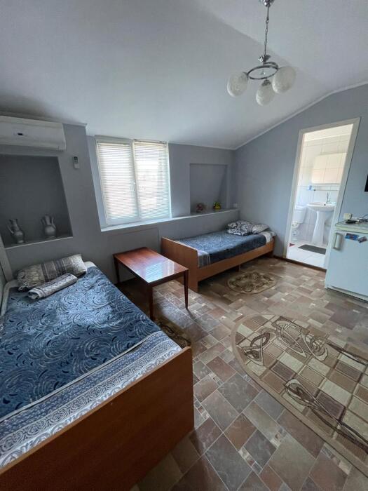 Уютный номер, состоит из 2-х комнат, основной и комнаты-прихожей, двери между ними нет. Номер не жаркий, что является большим плюсом крымским летом. Рядом кухня на несколько номеров для самостоятельного приготовления пищи, а также терраса со столиками для отдыха и приема пищи, вечерних посиделок и просто отдыха. ПРОШУ ОБРАТИТЬ ВНИМАНИЕ ЛЕСТНИЦА НА ЭТАЖ ВИНТОВАЯ, удобные марши и не представляет опасность ,за исключением людей с проблемами опорно-дв.системы.Оплата наличными. В случае досрочного выезда удерживается стоимость одних суток.Предоставляем трансфер за доп. оплату.