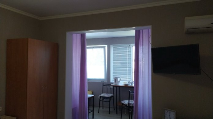 Уютный номер оборудован всей необходимой мебелью, есть балкон, с которого открывается прекрасный вид на море. Рядом с номером расположена кухонная зона для самостоятельного приготовления пищи. Wi-Fi на всей территории гостевого дома. ПРОШУ ОБРАТИТЬ ВНИМАНИЕ ЛЕСТНИЦА НА ЭТАЖ ВИНТОВАЯ, удобные марши и не представляет опасность ,за исключением людей с проблемами опорно -дв.системы.насаждениями.Оплата наличными. В случае досрочного выезда удерживается стоимость одних суток.суток.Предоставляем трансфер за дополнительную оплату.
