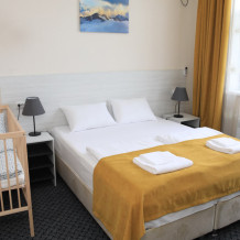 Номер состоит из двух комнат: большая двуспальная кровать или две односпальные кровати (по желанию) и небольшой диванчик, есть мини-кухня с СВЧ-печью. Данный номер отлично подойдет для семьи с двумя детьми. В комплектацию номера входит также 2 телевизора с плоским экраном, небольшой холодильник, сейф, 2 кондиционера, столик, стулья и прикроватные тумбочки. Санузел с душевой кабиной, раковиной, унитазом и феном в каждом номере. В каждом номере есть небольшой «французский» балкончик для сушки белья и пляжных принадлежностей. Расположен на втором этаже.
