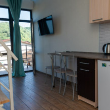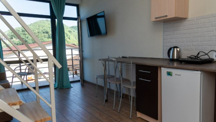 В номере телевизор с плоским экраном, небольшой холодильник, кондиционер, столик, стулья и прикроватные тумбочки. Полноценная кухня с плитой, раковиной, чайником и набором посуды.