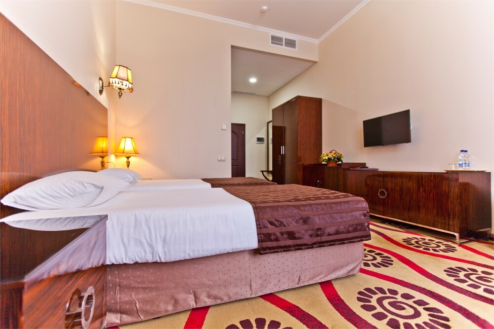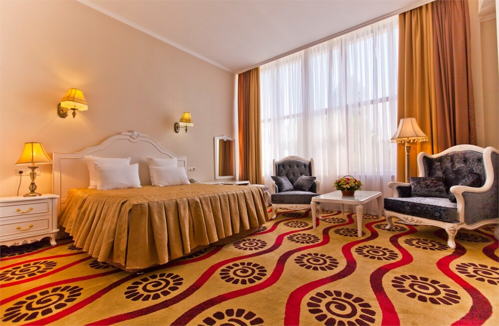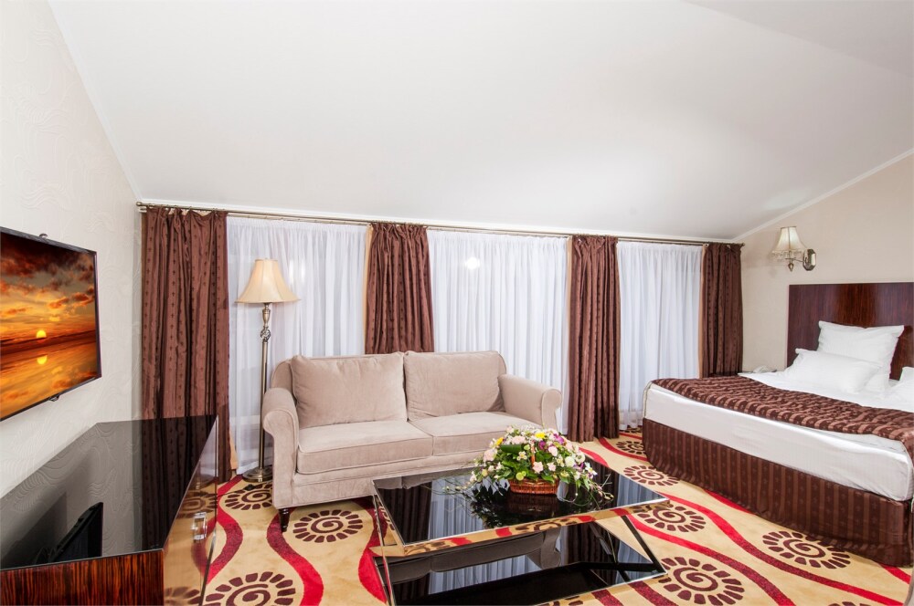 Двуспальная кровать, прикроватные тумбочки, ЖК-телевизор, телефон, письменный стол, мини-бар, сейф. Один ребёнок до 8 лет — можно без отдельного спального места.