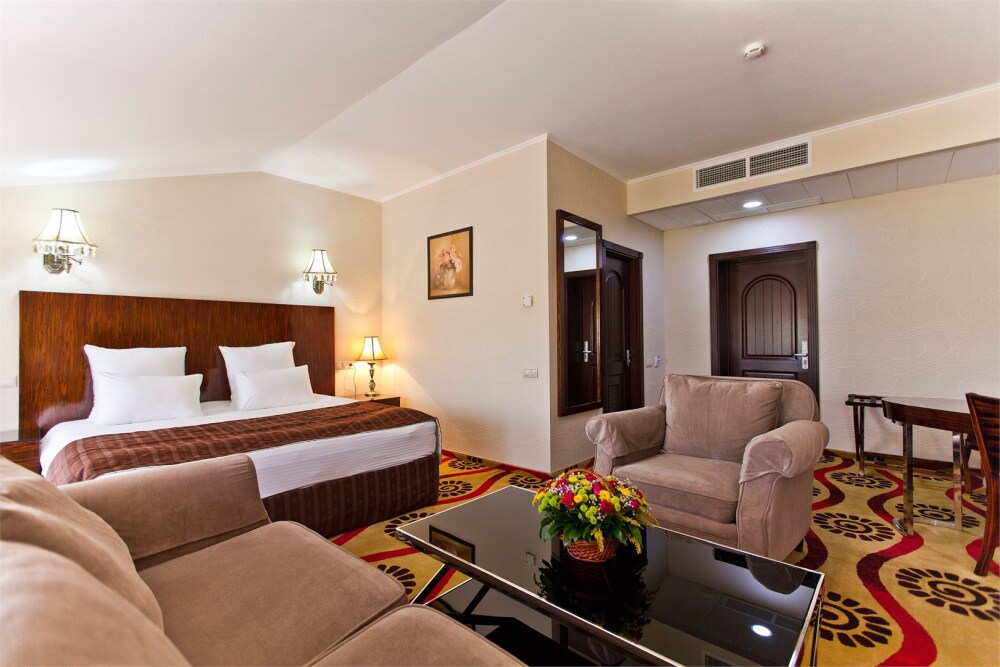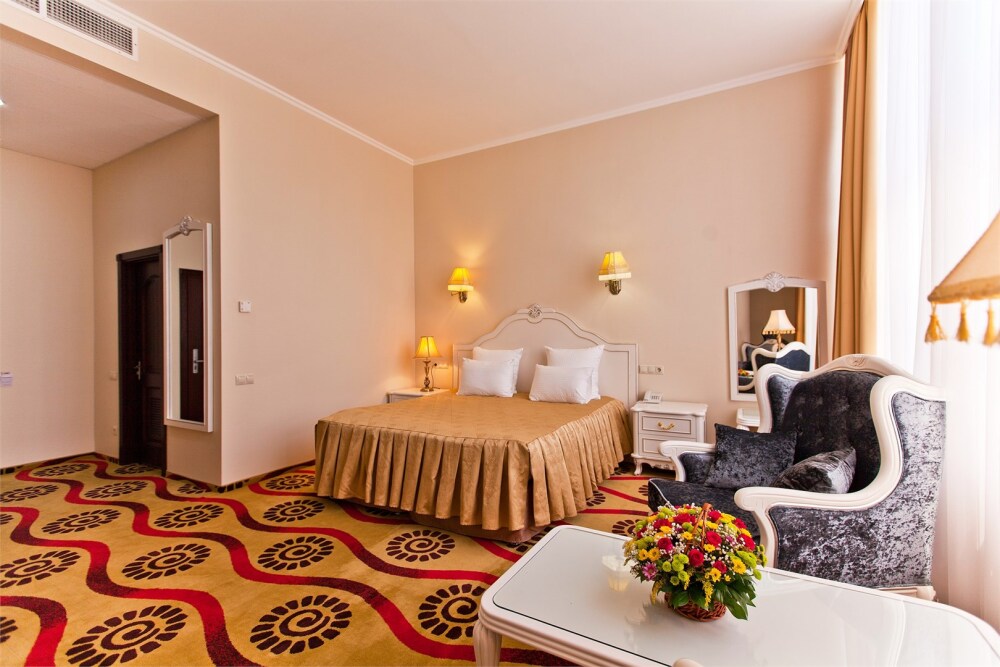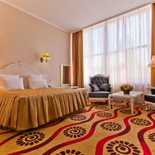 Люкс состоит из двух комнат (спальни и гостиной), очень компактной прихожей и прекрасно оборудованного санузла. Один ребёнок до 8 лет — можно без отдельного спального места.