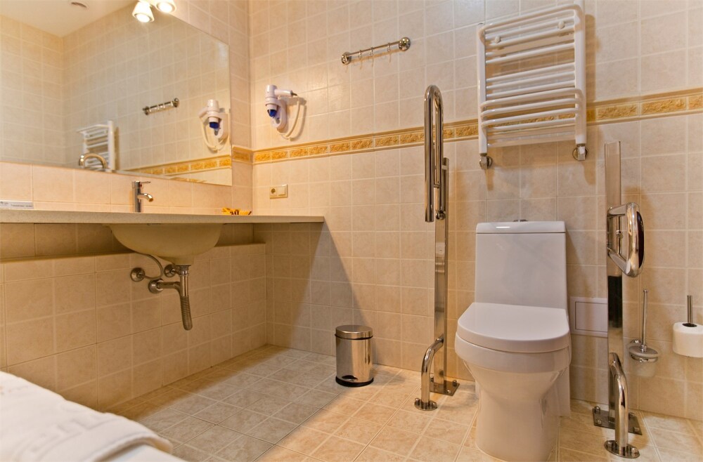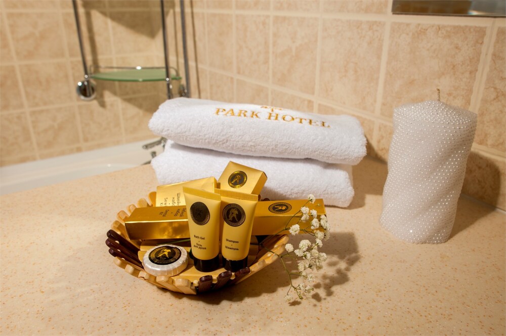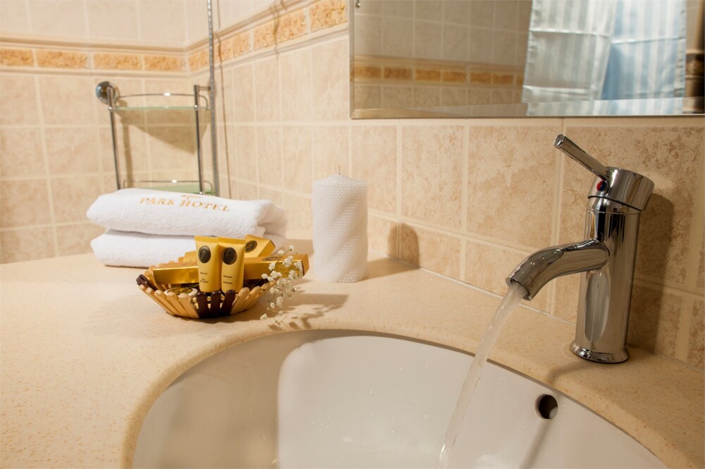 В ванной комнате: Ванная, раковина, унитаз, зеркало, комплект полотенец, одноразовые тапочки, набор гигиенических принадлежностей.