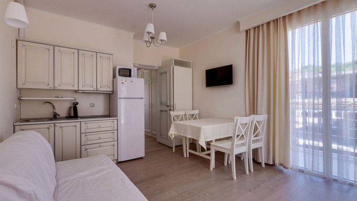 Территория отеля облагорожена, зона отдыха, детская площадка, детский аниматор, бассейн с лежаками с зонтами для отдыха, летний бар. На первом этаже отеля находится столовая, в которой работают профессиональные повара. Водоснабжение, электричество и отопление автономное, а это значит в сезон ни каких перебоев с водой и светом нет, оборудован пандус.