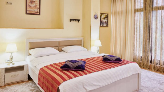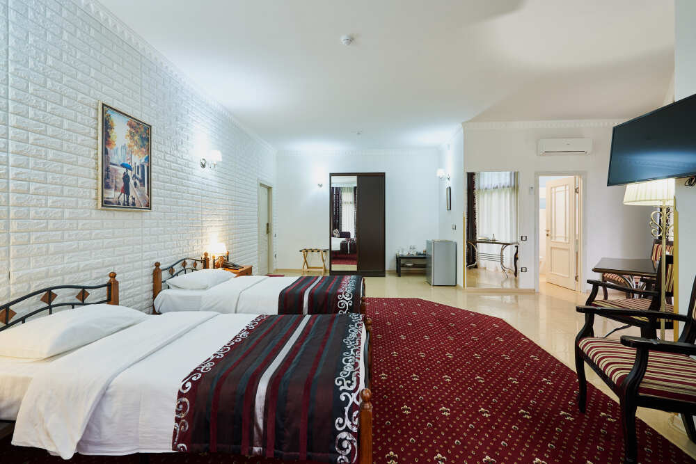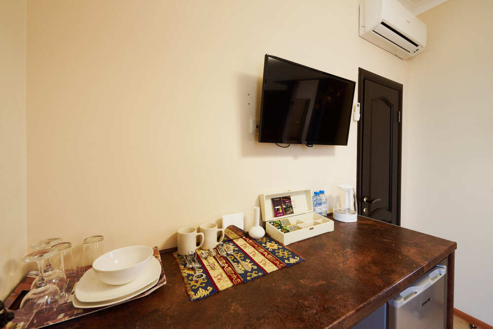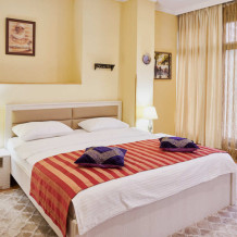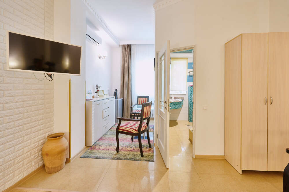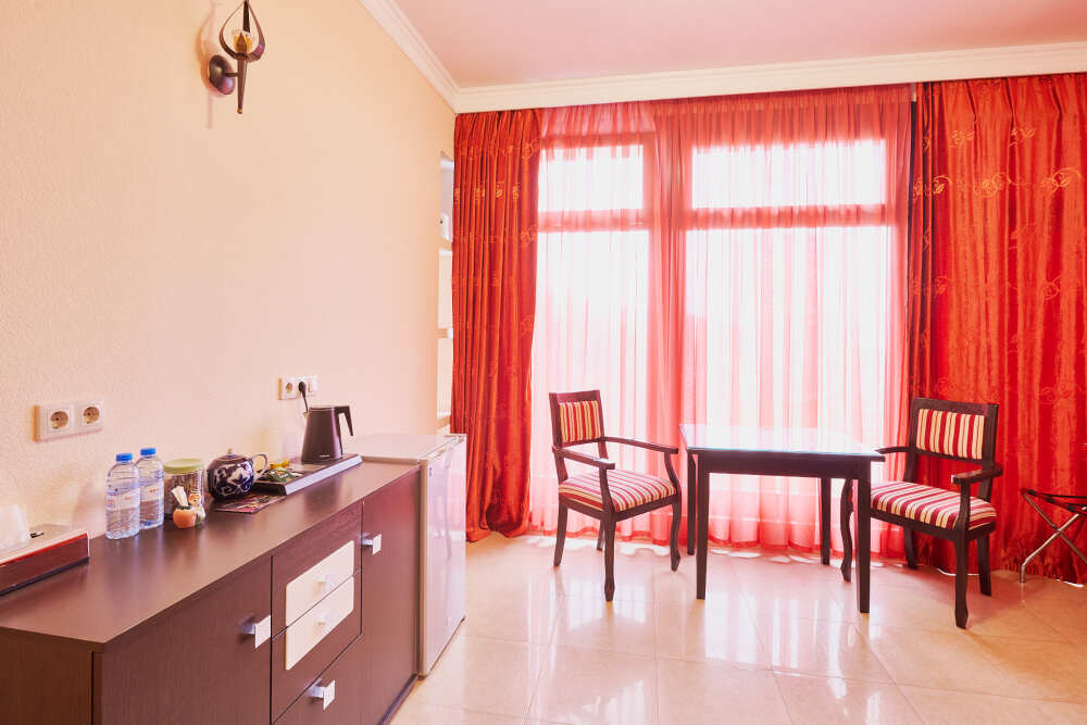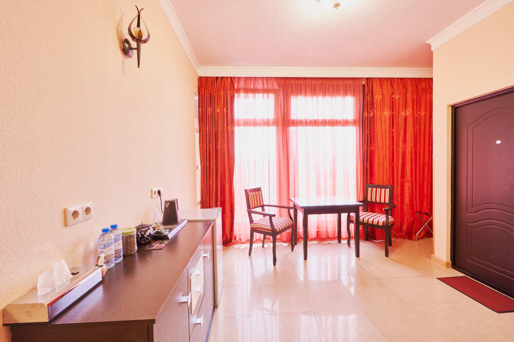 Гостевой дом оставил замечательное впечатление. Это маленькое, но очень уютное место с восточным интерьером, полным красоты и деталей. Наш номер был просторным, с высокими потолками и панорамными окнами, несмотря на то что был рассчитан на двоих. Все в номере было в отличном состоянии и предельно чисто. В наличии сейф, а также полный комплект посуды — ложки, вилки, тарелки и бокалы, что нас приятно удивило. Холодильник, хоть и не самый большой, отлично справляется с охлаждением. Каждый день нам ставили две бутылочки воды, был чай и кофе. Уборка проводилась регулярно, и все запасы вовремя пополнялись. Завтраки были очень разнообразными и сытными, хватало почти до вечера. В меню входили рис, котлеты, овощи, компот, кофе, запеканки, сладости и сухофрукты — каждый мог выбрать себе что-то по вкусу. На первом этаже свободно доступны утюг и микроволновка. В ванной комнате были жидкое мыло, шампунь, кондиционер, а также зубные щетки и паста в индивидуальных упаковках. Персонал был очень дружелюбным и внимательным. До моря примерно 20 минут пешком — путь туда с горы, а обратно придется подниматься. Много лестниц. Кроме того, предоставлен хороший Wi-Fi.
