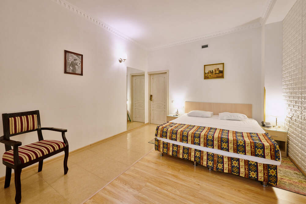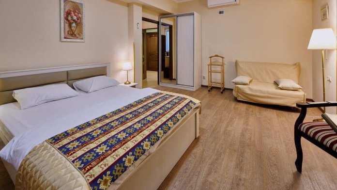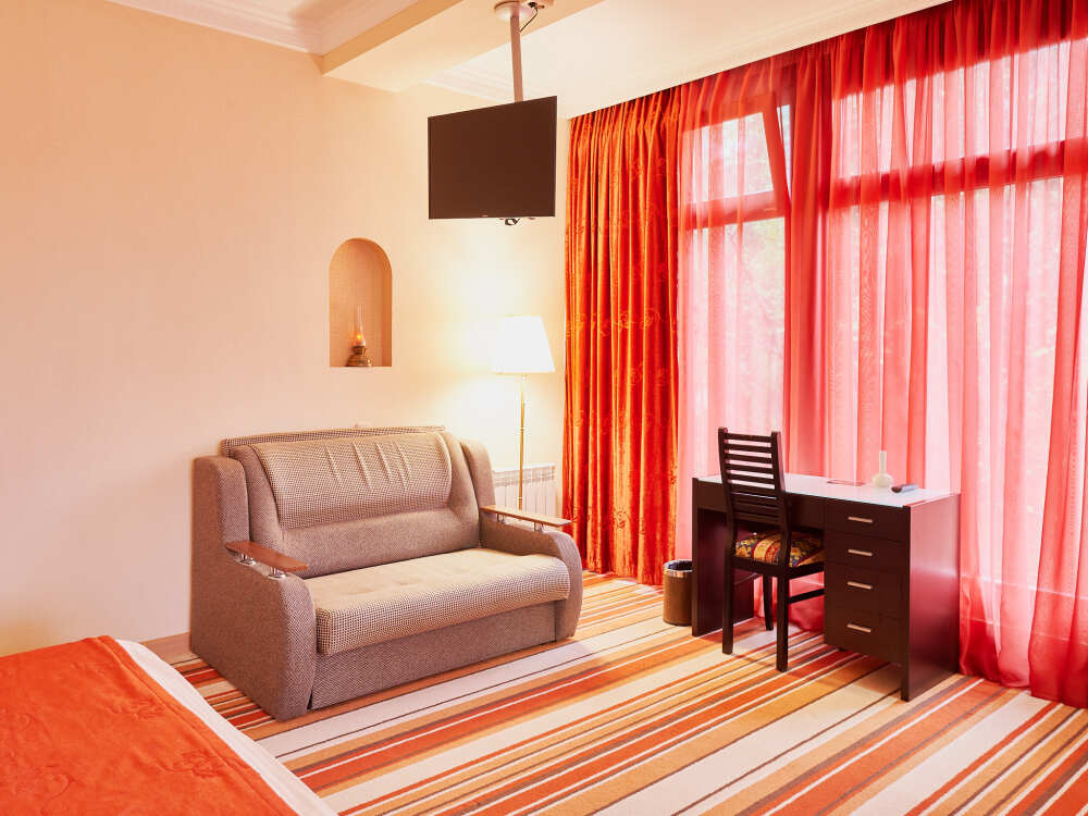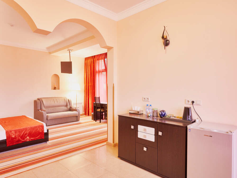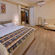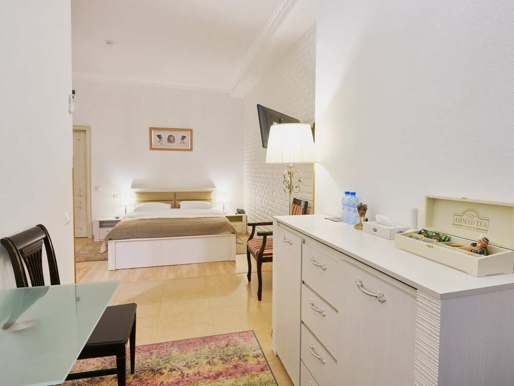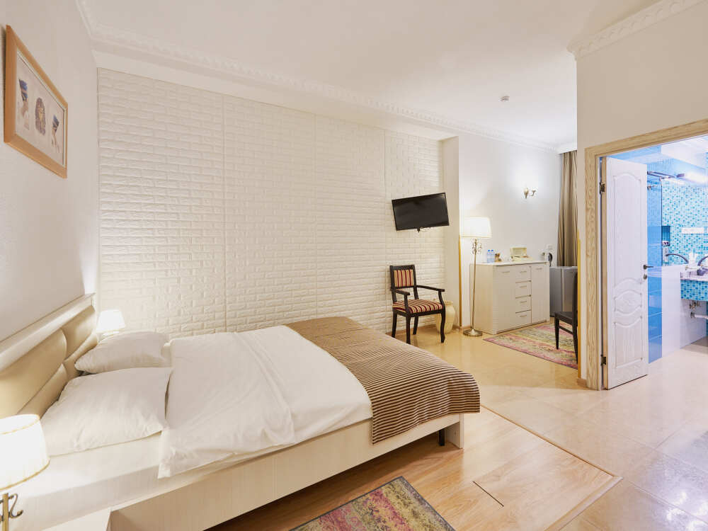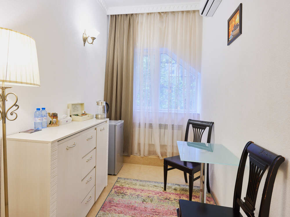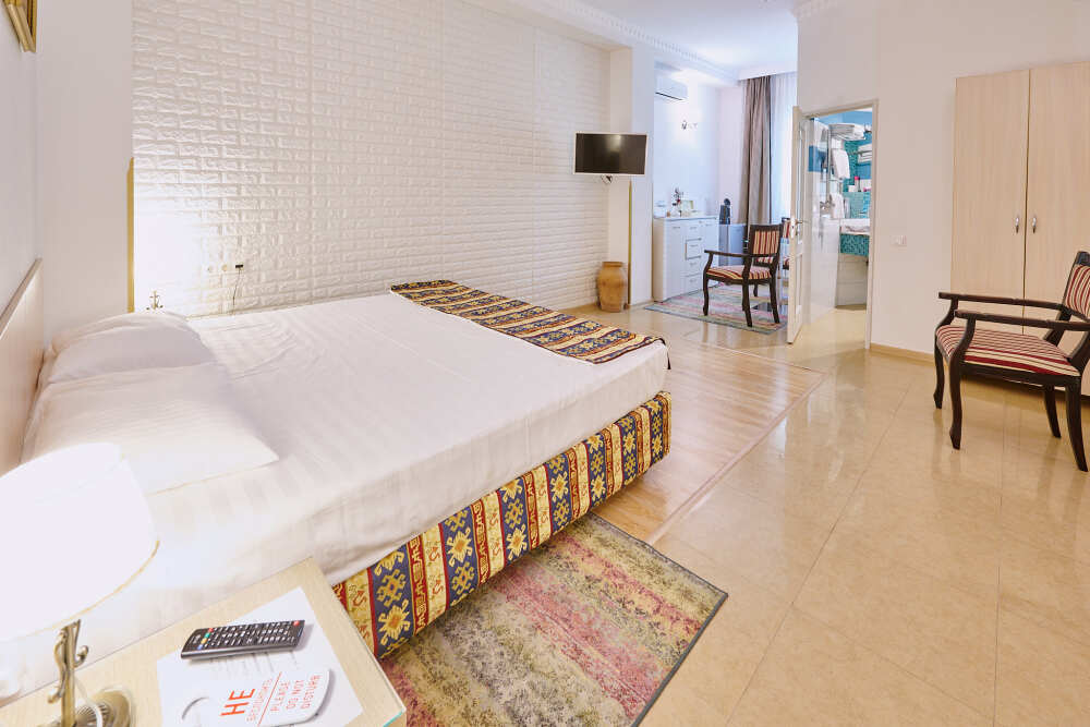 Мы провели 8 дней в этом чудесном гостевом доме в июле этого года и остались в полном восторге. Нам очень понравилось! Номера комфортные и хорошо оборудованные, разделены на спальню и зону отдыха. Кровать удобная, есть хороший шкаф, комод и стильные кресла с элегантным стеклянным столом. В наличии чайник, чашки, вилки, ложки, тарелки, а также чай и кофе. Каждый день нам ставили две бутылочки воды. Номер оснащен холодильником и кондиционером. Декор с красивыми шторами, всё сделано с любовью. Ванная комната просторная, с большой ванной и феном, полотенцесушитель работает отлично, горячая вода без перебоев. Освещение в номере и в ванной комнате хорошее, много места для хранения вещей.