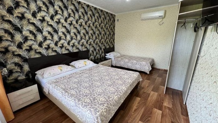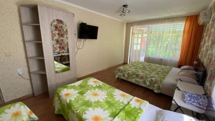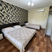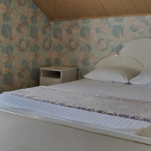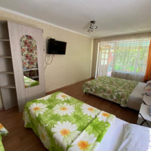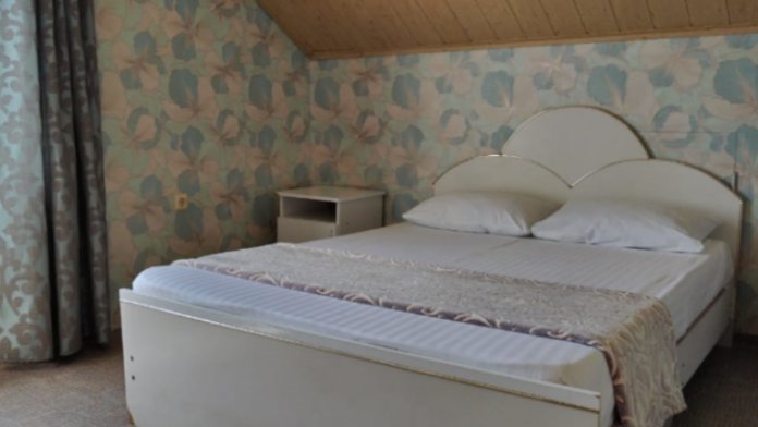 К Вашим услугам уютные чистые номера со всеми удобствами (сплит-система, санузел, телевизор, холодильник) 2,3,4-местные номера. Во дворе имеется мангал, кухня. На второй этаж гостиницы ведет винтовая лестница. Двухместные номера без балконов находятся на мансардном этаже гостиницы и имеют скошенный угол потолка(на фото видно).