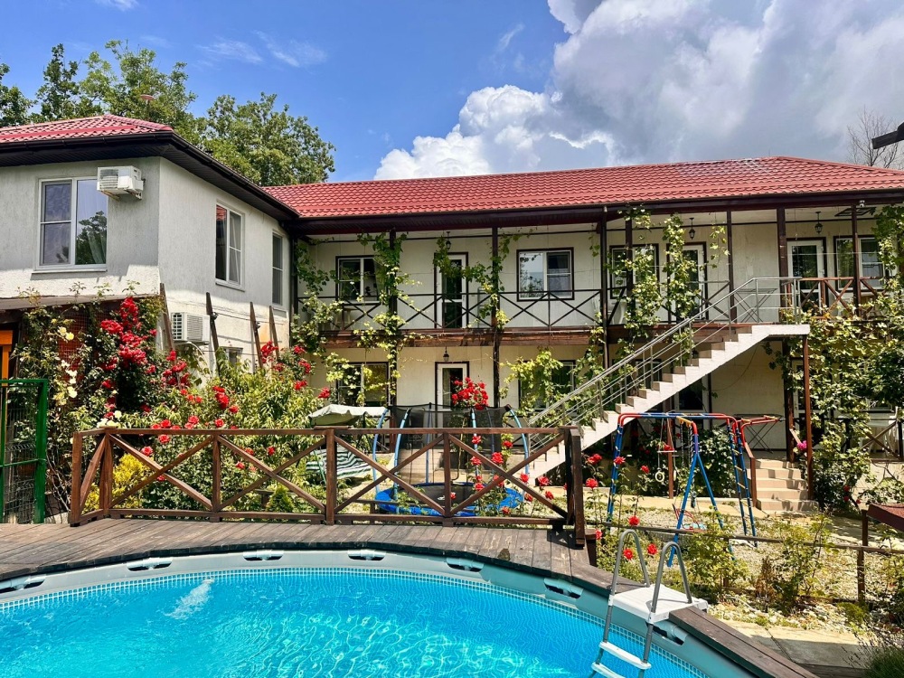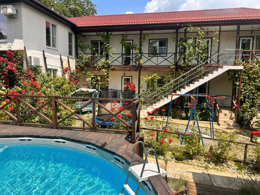 На территории общая кухня под навесом, в коттеджах своя кухня. У всех номеров большие веранды с видом на море и на горы. Много зелени, даже в самую жару легко дышится. Большой глубокий бассейн, зона для загара с шезлонгами. На территории есть детская площадка и батут, зона барбекю, зоны отдыха. К морю ведет тенистая пологая лестница 169 ступеней, переход через дорогу - зебра, камеры.