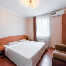 В номере категории комфорт может разместиться до 3 гостей. Для вашего удобства в номере двуспальная кровать или две односпальные , диван - кровать, 2 тумбочки, шкаф для одежды, телевизор, кондиционер, холодильник, собственная ванная комната, комплект постельного белья, набор полотенец.