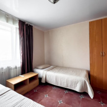 Небольшой, уютный номер эконом- класса. Для вашего удобства в номере представлены 2 односпальные кровати, 2 тумбочки, шкаф для одежды, вешалки, телевизор, вентилятор, комплект постельного белья, полотенец. Душ и туалет находится рядом с номером, в пользовании гостей фен. Номера расположены на 4 этаже. Кухня для самостоятельного приготовления пищи на 3 этаже.