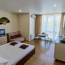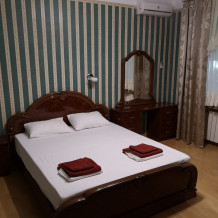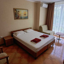 Гостевой дом предлагает 12 комфортных номеров в трех категориях. Из окон фасадной части гостевого дома открывается вид на огромную, утопающую в зелени территорию санатория «Известия». Территория гостевого дома 9 соток, включающая в себя небольшую детскую площадку, сад с мангальной зоной, летнюю кухню с большой террасой (80 кв.м), где под виноградом можно покушать и насладиться пением птиц. Во всем доме работает бесплатная сеть Wi-Fi. За дополнительную плату Вы можете воспользоваться услугами прачечной.