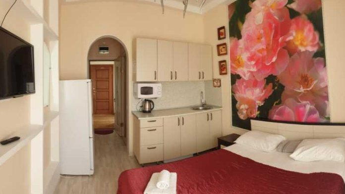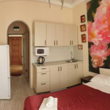 В апартаментах одна двуспальная кровать, кухонная зона, телевизор, фен, утюг, холодильник, чайник, микроволновая печь и электрическая плита. Кондиционер, сейф. Душевая и туалетная комнаты в апартаментах. В стоимость апартаментов входит парковка, бесплатное пользование Wi-Fi, банные принадлежности.