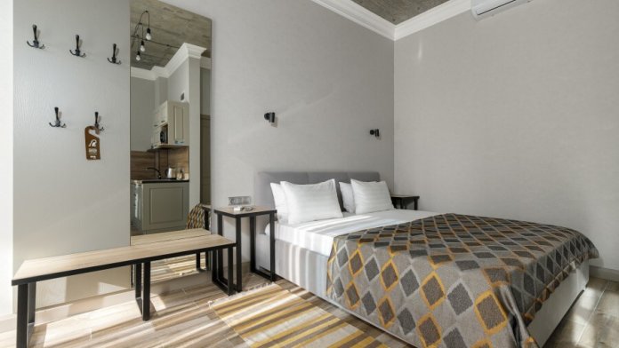 В номере есть кухонный гарнитур с раковиной и микроволновая печь.