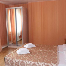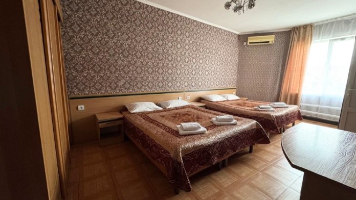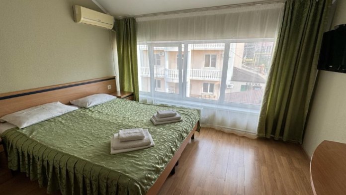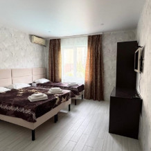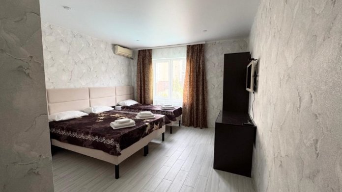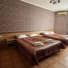 Двуспальная кровать+односпальная или три односпальные кровати, шкаф, тумбочка, стол, телевизор, мини-холодильник, сплит-система, с/у совмещен с душем (бортики),Wi-Fi. Площадь номеров от 18 до 20 кв.м. Общий балкон.