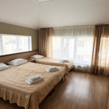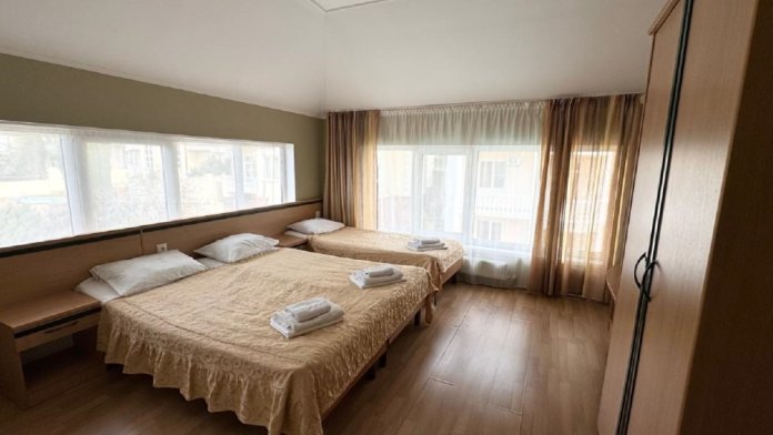 Двуспальная кровать+односпальная или три односпальные кровати, шкаф, тумбочка, стол, телевизор, мини-холодильник, сплит-система, с/у совмещен с душем (бортики),Wi-Fi. Площадь номеров от 17 до 20 кв.м.