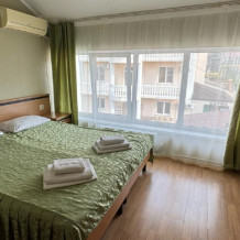 Двуспальная кровать или две односпальные кровати, шкаф, тумбочка, стол, телевизор, мини-холодильник, сплит-система, с/у совмещен с душем (бортики),Wi-Fi. Площадь номеров от 18 до 20 кв.м. Общий балкон.