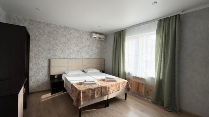 Двуспальная кровать или две односпальные кровати, шкаф, тумбочка, стол, телевизор, мини-холодильник, сплит-система, с/у совмещен с душем (бортики).Wi-Fi. Площадь номеров от 17 до 20 кв.м.