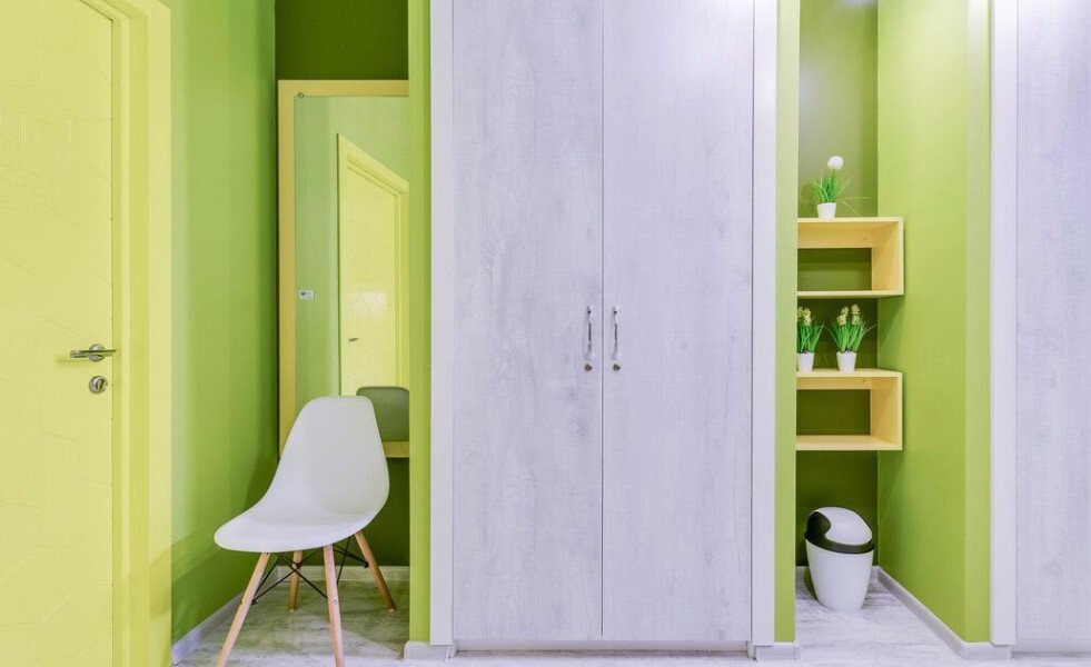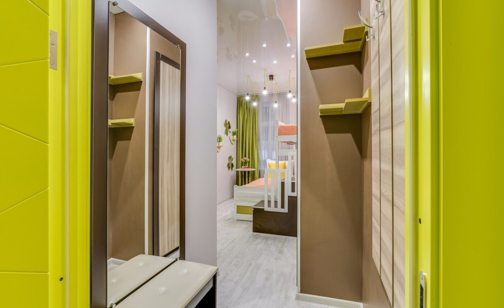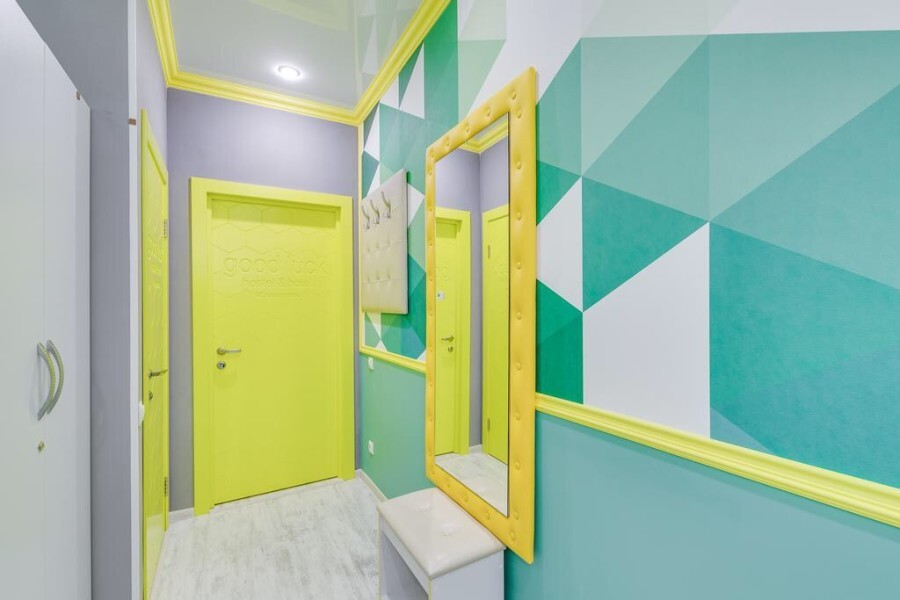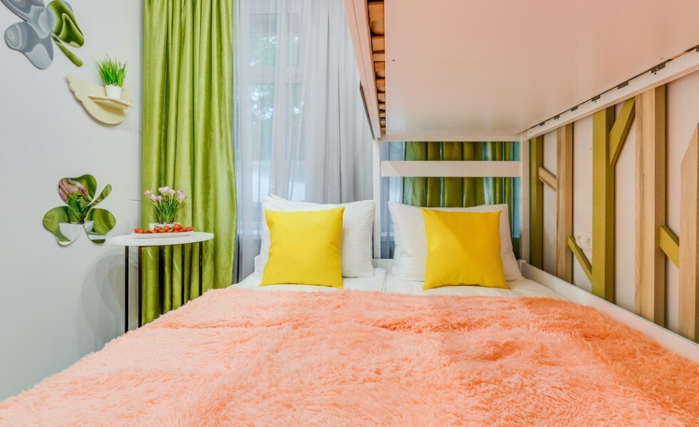 Красивым и уютным этот номер делают экологичные материалы и жизнерадостные цвета персика, лайма и шоколада. Одну из стен украшают зеркала в форме клевера. При входе стоит большой шкаф для хранения вещей.