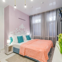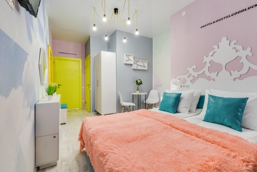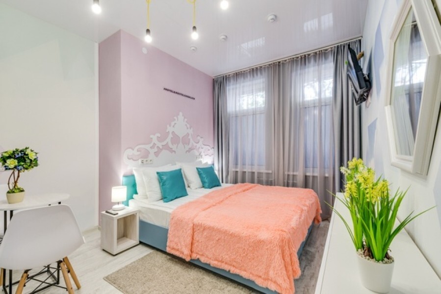 Лиловый и другие пастельные тона делают этот двухместный номер особенно уютным и теплым. Стену над кроватью украшает разноцветная мозаика. Полки интересных форм, дизайнерские светильники, необычные тумбы вносят изюминку в светлое пространство и делают пребывание здесь действительно приятным.