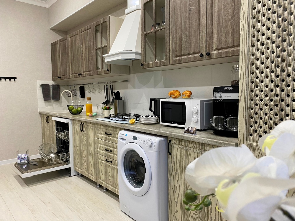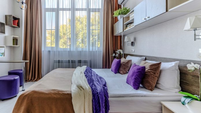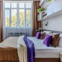 Номер отлично сочетают в себе: спальную, кухонную и гостевую зоны, с двуспальной или двумя раздельными односпальными кроватями на выбор. Дизайнерское оформление номеров, окна с подсветкой, которые выглядят очень реалистично и эффектно, роллеты с автоматическим ручным управлением на проветривание и открывание окна.