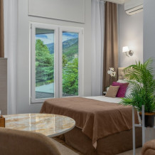 Lux Promo - 2-х или 4-х местный семейный Люкс площадью 30 м² с двуспальной или двумя односпальными кроватями на выбор и раскладным диваном. В номере удобная мебель, кондиционер, телевизор, холодильник, душ в ванной комнате, фен, сейф и бесплатный Wi-Fi. Приветственный набор, чай, кофе и бутилированная вода.