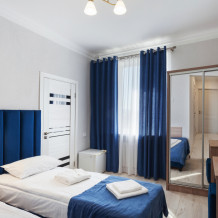 Семейный двухкомнатный номер с четырьмя односпальными кроватями и раскладывающимся односпальным диваном. В номере есть всё необходимое для комфортного проживания: небольшой балкон, телевизор, кондиционер, мини-холодильник, электрический чайник, фен, зеркало, место для хранения одежды и набор посуды.
