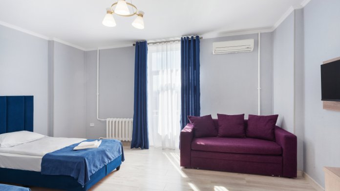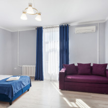 Стандартный четырёхместный номер с двумя односпальными кроватями и раскладным диваном. В номере есть всё необходимое для комфортного проживания: кондиционер, телевизор, мини-холодильник, электрический чайник, фен, зеркало, небольшой балкон, место для хранения одежды и набор посуды.