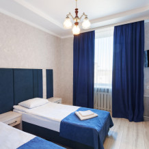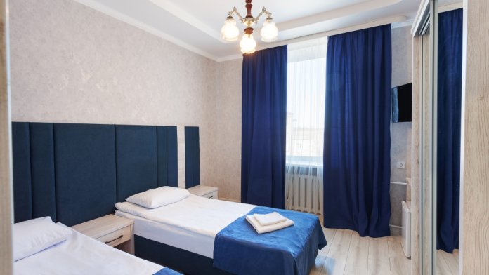 Стандартный двухместный номер с двумя односпальными кроватями. В номере есть всё необходимое для комфортного проживания: телевизор, кондиционер, мини-холодильник, электрический чайник, фен, зеркало, место для хранения одежды и набор посуды. Собственная ванная комната оборудована душем. Предоставляются туалетные принадлежности, халаты и тапочки. Для общего пользования гостей — WI-FI, кулер с горячей и холодной водой, микроволновка, утюг и гладильная доска.