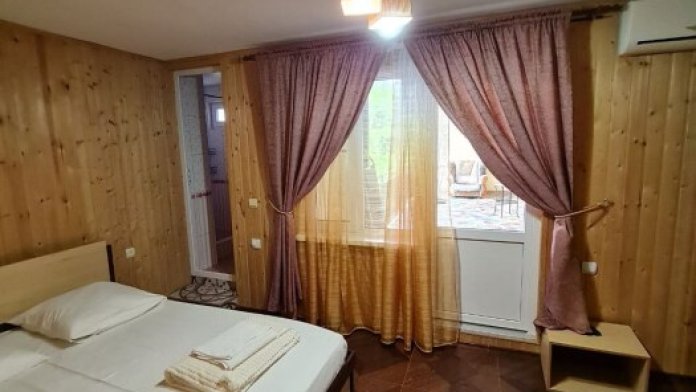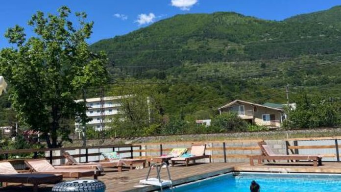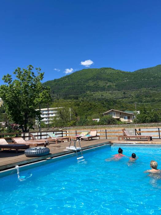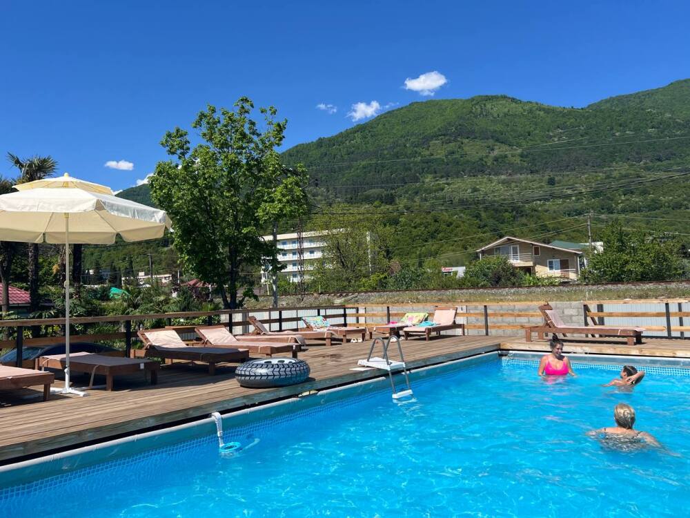 Отель расположен у подножия горы. Изюминкой гостевого дома по праву можно считать небольшой субтропический палисадник с фонтаном из горных камней. По территории протекает небольшая речка, где плавает живая форель.