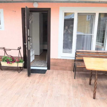 холодильник, обеденный столик, микроволновая печь, посуда. Открытая терраса для чаепития и отдыха на свежем воздухе. Санузел - туалет, ванна.