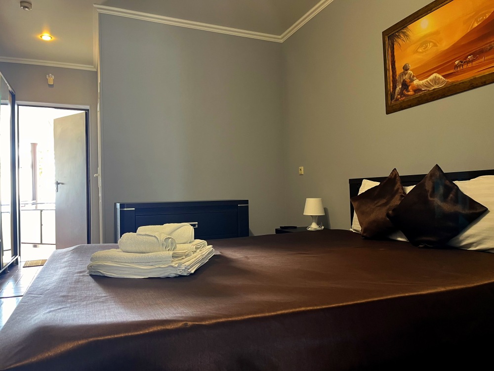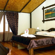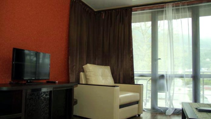 Номер состоит из двух комнат, что позволяет отдыхать с детьми или большой компанией, не испытывая дискомфорта. В первой комнате находится двуспальная кровать, шкаф-купе, комод и прикроватные тумбочки. Во второй комнате стоит холодильник, диван-кровать, кресло, и журнальный столик. ЖК телевизор и кондиционер. Санузел с душем, туалетные принадлежности (гель для душа, мыло одноразовая,тапочки, шампунь), фен, предметы посуды. Предоставляются банные полотенца. Номер снабжен сейфом, и находится под охранной сигнализацией. Бесплатный Wi-Fi. На балконе стоит стол со стульями.