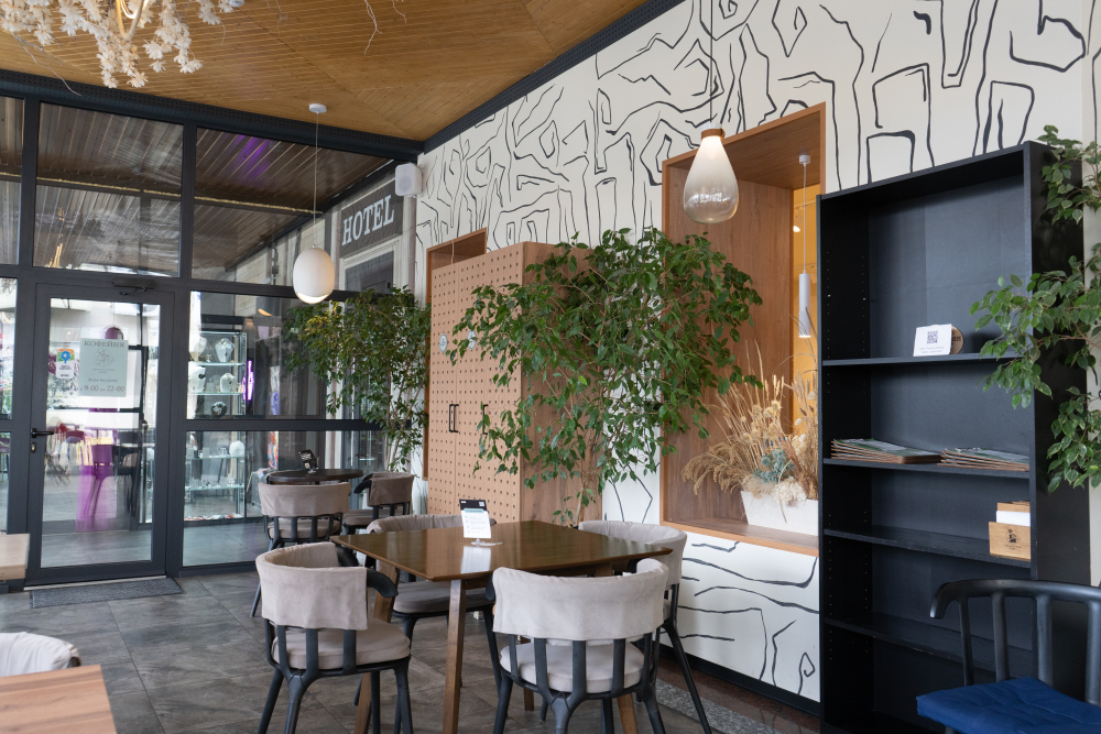 В самом отеле расположена кофейня, где Вы можете выпить чашечку ароматного, вкусного, бодрящего кофе, побаловать себя выпечкой собственного производства, вкусными блинчиками или сытными бутербродами с сёмгой или курицей, именно там есть разнообразные вкусные блюда и напитки.