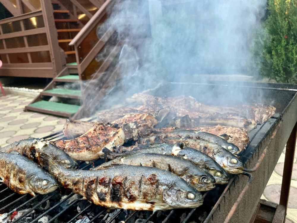 На территории отеля для Вас: оборудованная зона барбекю - казан,мангал,коптильня, летняя терраса с полностью оборудованной кухней, кальян, охраняемая парковка на 10 мест, видеонаблюдение, стиральная машина, высокоскоростной WI-FI по всей территории отеля. Алкогольные и безалкогольные напитки местного производства, всегда в охлажденном виде. Домашнее вино, чача, горный мед, домашние компоты (фейхоа, лавровишня, алыча, мушмула). Без добавления консервантов, все натуральное.