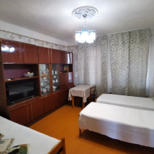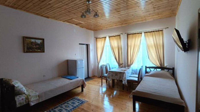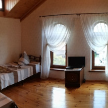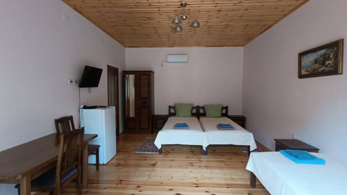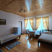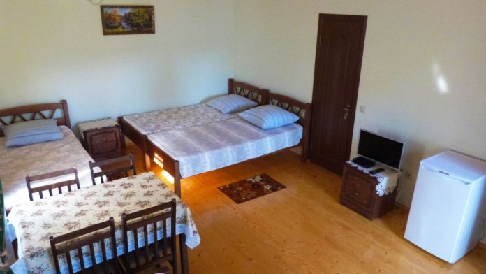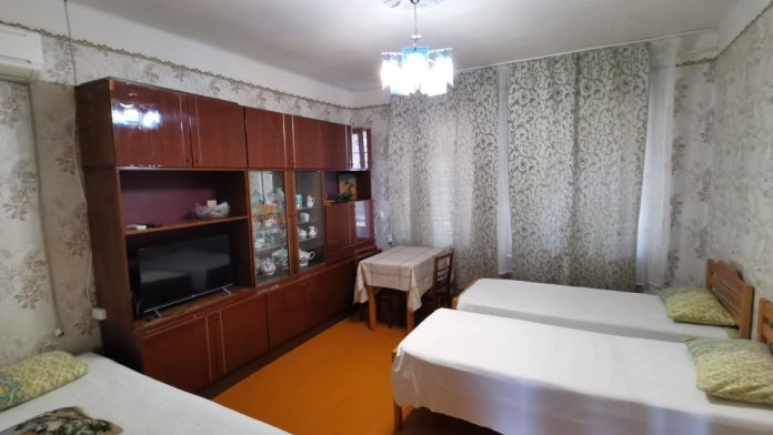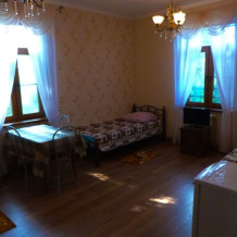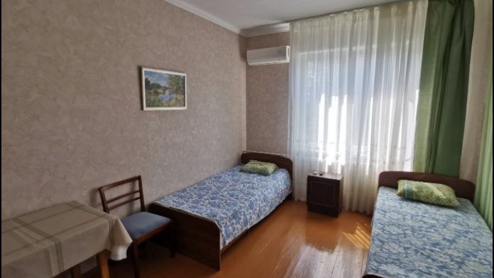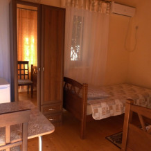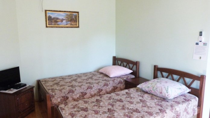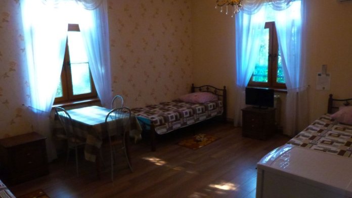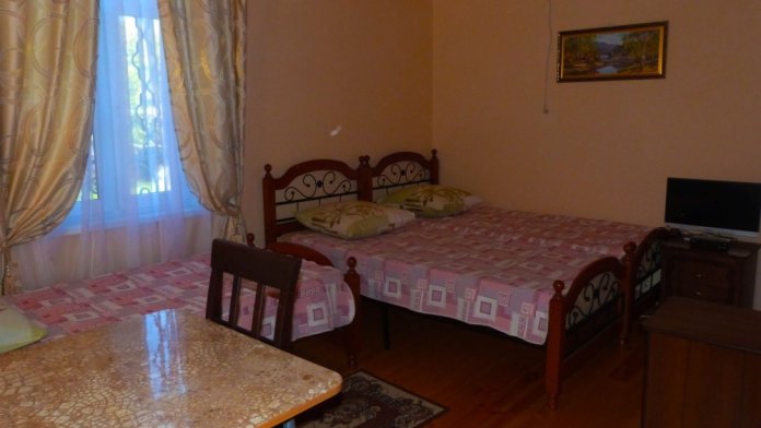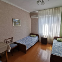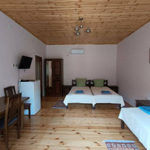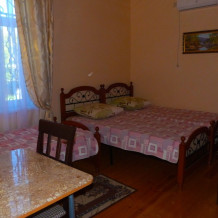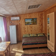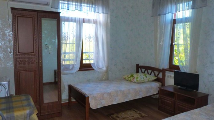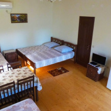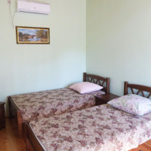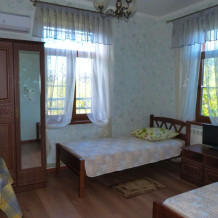 Всего два номера рядом с друг другом. Для данных номеров предусмотрен общий душ и туалет на два номера. Один номер - 2-местный, второй 3-местный + доп.место. Очень удобно для больших семей - родители и дети (бабушки, дедушки, друзья) отдельно. В каждом номере телевизор, интернет wi-fi, холодильник, кондиционер, удобные шкафы и прикроватные тумбочки, стол и стулья, сменные полотенца, фен, полутороспальные кровати с ортопедическими матрасами. Для каждого номера предусмотрены полностью оборудованные кухни и мангал для приготовления шашлыков.