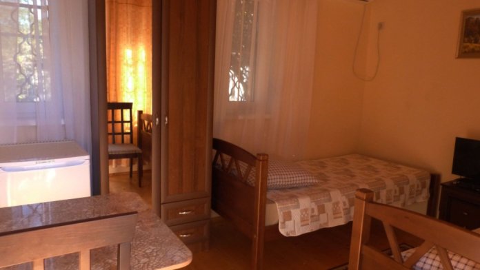 В каждом номере телевизор, интернет wi-fi, холодильник, кондиционер, удобные шкафы и прикроватные тумбочки, стол и стулья. Данные номера имеют два отдельных санузла с душем (с феном для сушки волос), туалетом, умывальником расположенные рядом с домом, очень удобные и комфортные. Каждые 7-10 дней производится смена белья. Кухня общая, оборудованная всем необходимым включая посуду. Также Вы можете питаться в ближайшем отеле по системе «все включено» с видом на море или брать отдельно завтраки, обеды, а ужинать в кафе на берегу моря. Для автомобилей предоставляется бесплатная парковка.