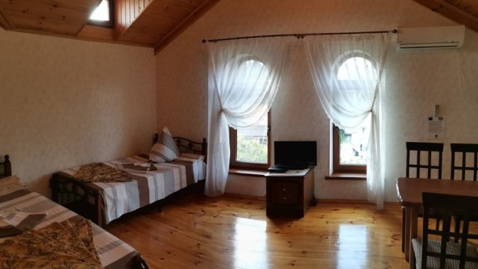 В Вилле номер люкс расположен на 3-ем этаже (мансарда). Номер 3-местный и доп.место, очень просторный. Других номеров на этаже нет, Вы будете одни. Номер оборудован собственным душем и туалетом. В номере телевизор, интернет wifi, холодильник, кондиционер, удобные шкафы и прикроватные тумбочки, стол и стулья, сменные полотенца, фен, полутороспальные кровати с ортопедическими матрасами. Для номера предусмотрена полностью оборудованная кухня и мангал для приготовления шашлыков.