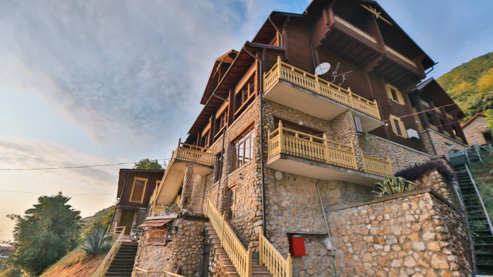 Современный комфортабельный отель высокого уровня расположен в старом районе г. Гагра, на склоне горы в 70 м над уровнем моря. Здание виллы построено из оцилиндрованных бревен, которые имеют прекрасное свойство пропускать кислород. Комфортная температура во всех помещениях виллы поддерживается системой климат- контроля. Из номеров открывается захватывающий панорамный вид на город, горы и море.