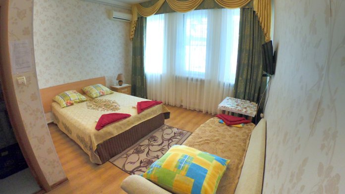 Двухкомнатный семейный номер идеально подойдёт для отдыха большой семьёй. В номере имеется сплит-система, ЖК телевизоры, холодильник, чайник, фен.