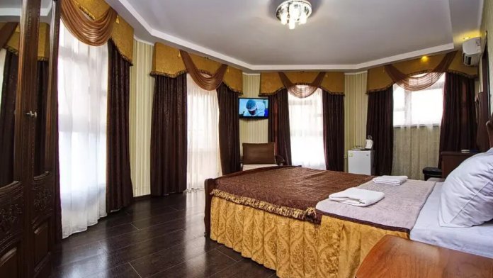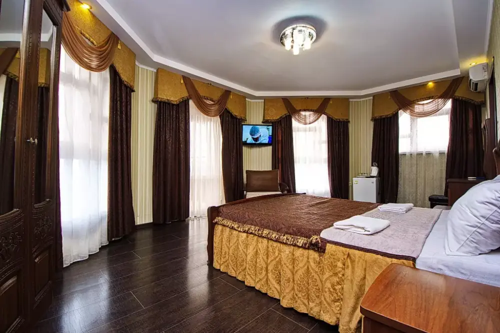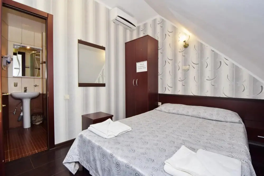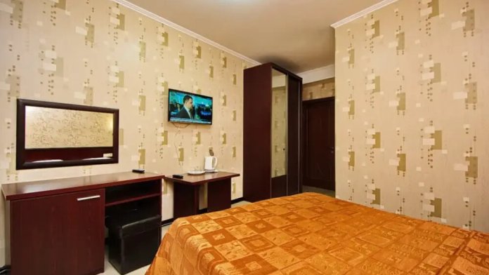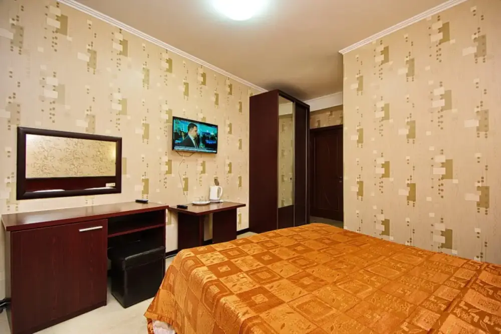 В номере: двуспальная кровать, шкаф-купе с зеркалом, прикроватные тумбочки, стол, ЖК-телевизор, холодильник, чайник, кондиционер, одно одеяло, две бутылки воды (единоразово, при заезде), две пары одноразовых тапочек (единоразово, при заезде).