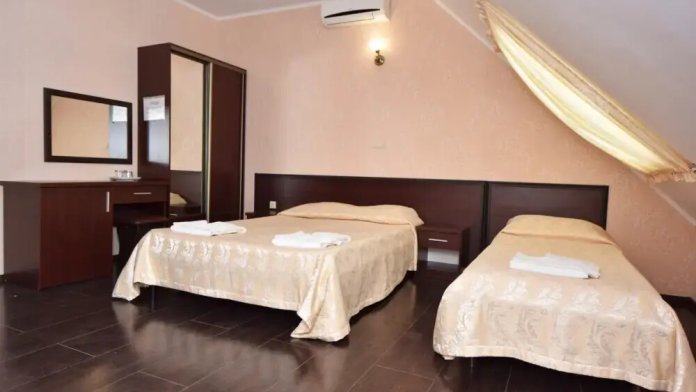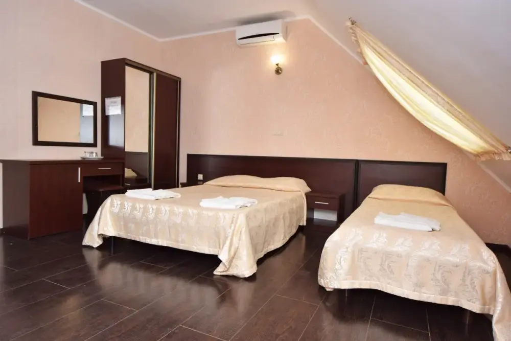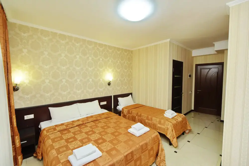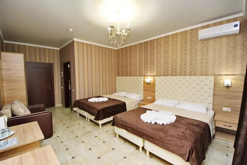 В номере: двуспальная и односпальная кровати, прикроватные тумбочки, шкаф-купе с зеркалом, стол, ЖК-телевизор, холодильник, чайник, кондиционер, одно одеяло, три бутылки воды (единоразово, при заезде), три пары одноразовых тапочек (единоразово, при заезде).