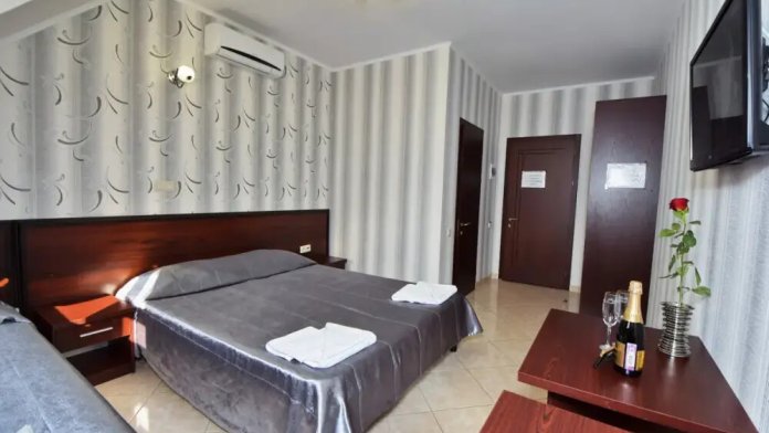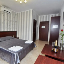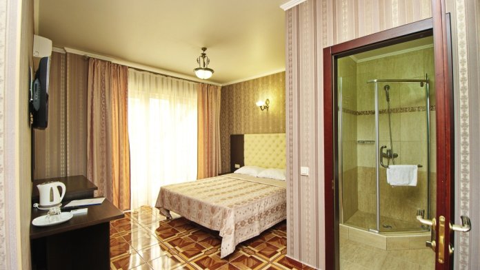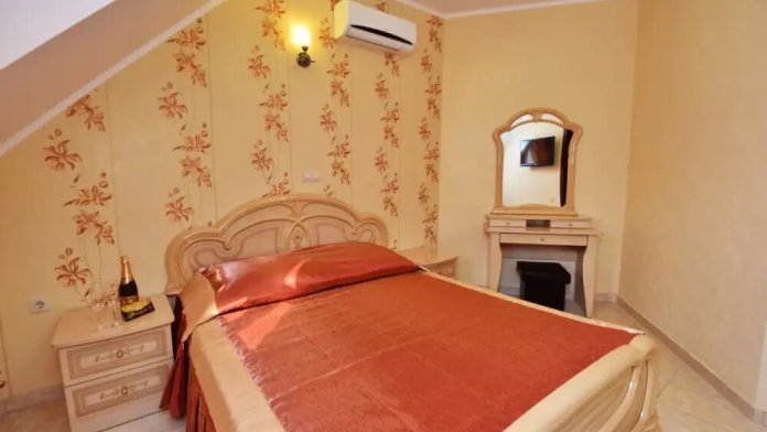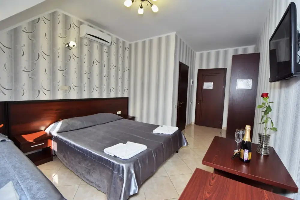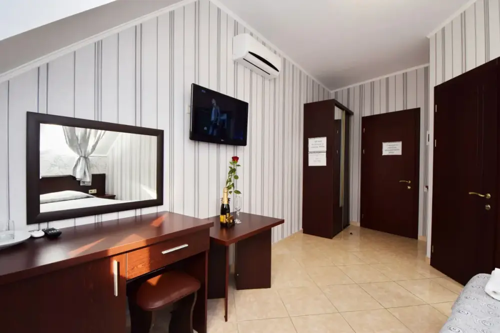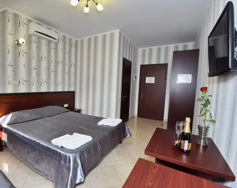 В номере: двуспальная кровать, прикроватные тумбочки, шкаф-купе с зеркалом, стол, ЖК-телевизор, холодильник, чайник, кондиционер, одно одеяло, две бутылки воды (единоразово, при заезде), две пары одноразовых тапочек (единоразово, при заезде).