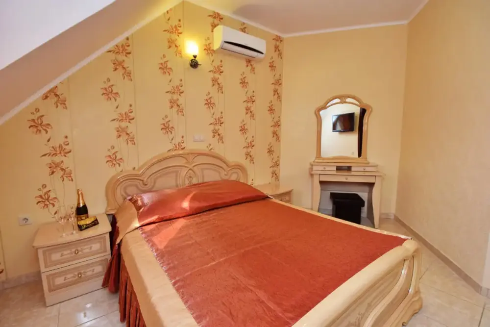 В спальне: двуспальная кровать, прикроватные тумбочки, туалетный столик, ЖК-телевизор, кондиционер, одно одеяло, четыре бутылки воды (единоразово, при заезде), четыре пары одноразовых тапочек (единоразово, при заезде).
