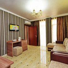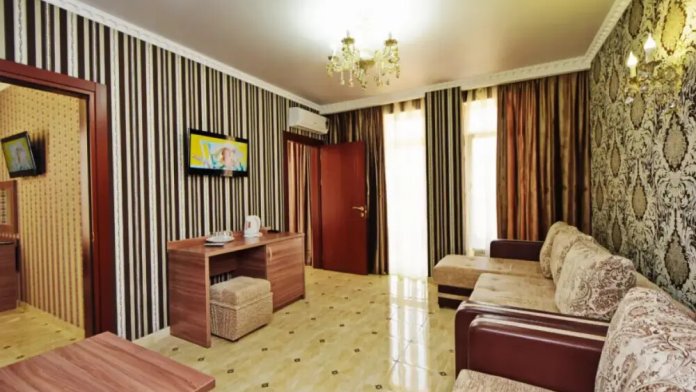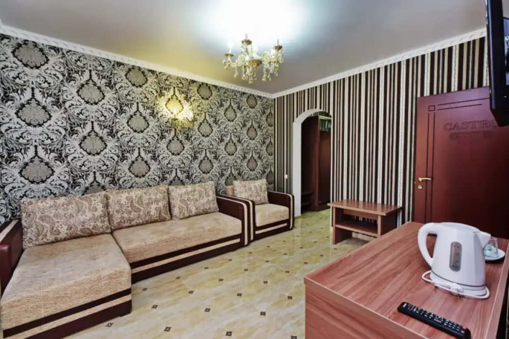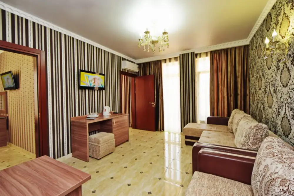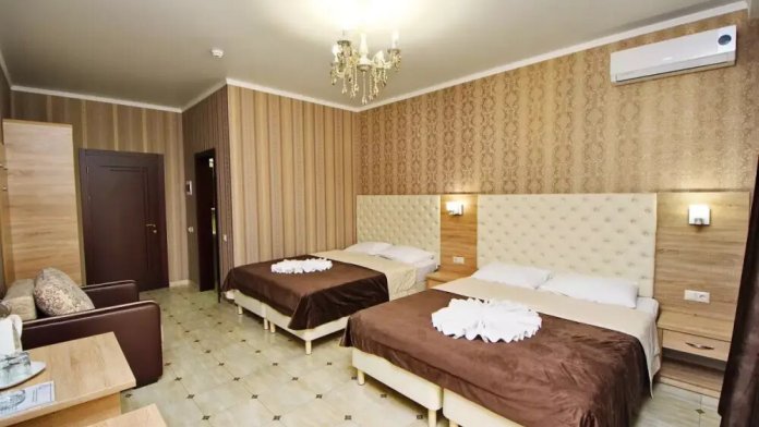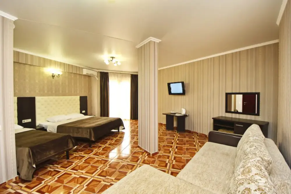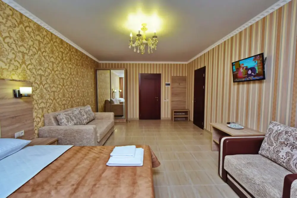 В номере: двуспальная кровать, кресло кровать и раскладной диван, прикроватные тумбочки, шкаф-купе с зеркалом, стол, ЖК-телевизор, холодильник, чайник, кондиционер, одно одеяло, пять бутылок воды (единоразово, при заезде), пять пар одноразовых тапочек (единоразово, при заезде).