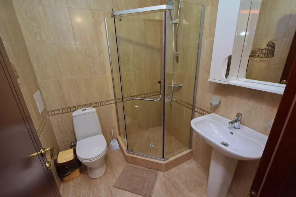 В ванной: душ, туалет, раковина, фен, набор полотенец, два халата, средства личной гигиены.