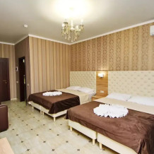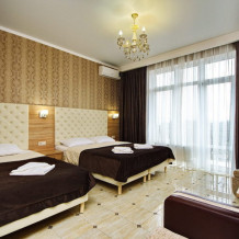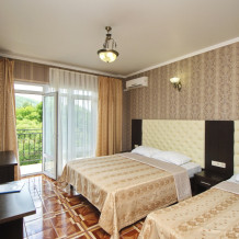 В номере: двуспальная и две односпальные кровати (либо двуспальная кровать, односпальная кровать и раскладное кресло), прикроватные тумбочки, шкаф-купе с зеркалом, стол, стулья, ЖК-телевизор, холодильник, кондиционер, чайник, балкон.