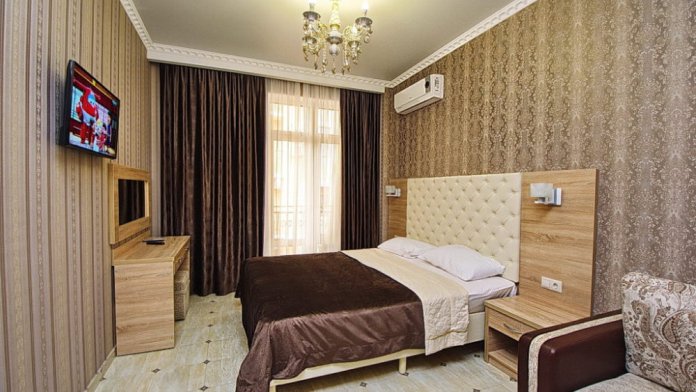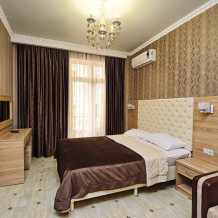 В номере: двуспальная кровать, прикроватные тумбочки, шкаф-купе с зеркалом, стол, стулья, ЖК-телевизор, холодильник, кондиционер, чайник, балкон.