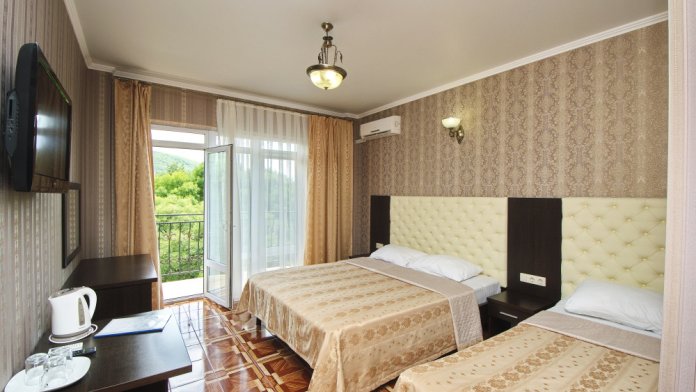 В номере: двуспальная и односпальная кровати, прикроватные тумбочки, шкаф-купе с зеркалом, стол, стулья, ЖК-телевизор, холодильник, чайник, кондиционер, балкон.