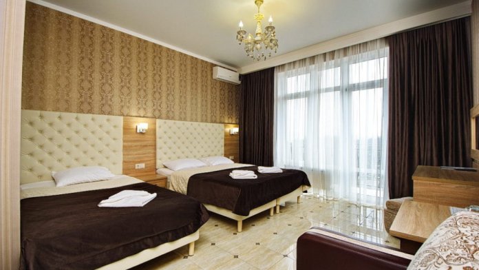 В номере: двуспальная кровать, односпальная кровать (либо раскладное кресло) и раскладной диван, либо две двуспальные кровати и раскладное кресло, прикроватные тумбочки, шкаф-купе с зеркалом, стол, стулья, ЖК-телевизор, чайник, холодильник, кондиционер, балкон.