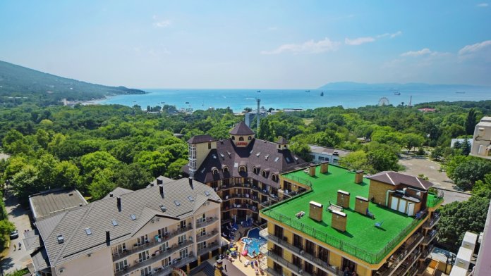 Это современный многоэтажный отель, оборудованный двумя лифтами, крытой и открытой автопарковками, крытым и открытым бассейнами с подогревом, баром, столовой, детской комнатой, детской анимацией, террасой для загара с тренажерами и потрясающим видом на Кабардинку.